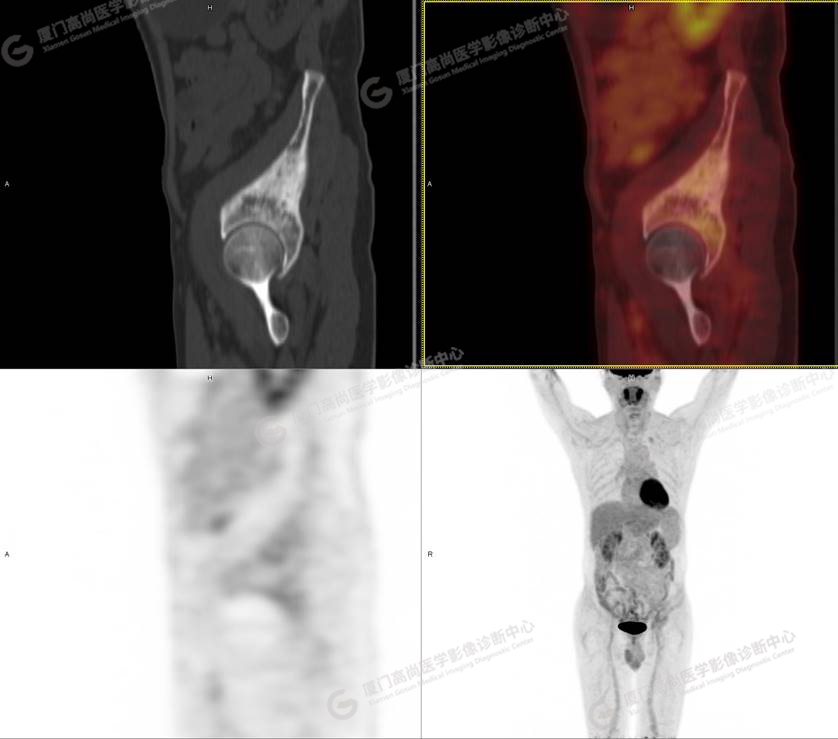 PET/CT所見:左側(cè)髂骨、髖臼及恥骨骨質(zhì)密度不均勻增高,CT值約594Hu,邊緣模糊,放射性攝取輕度增高,SUVmax 2.79,周圍軟組織未見明顯異常。