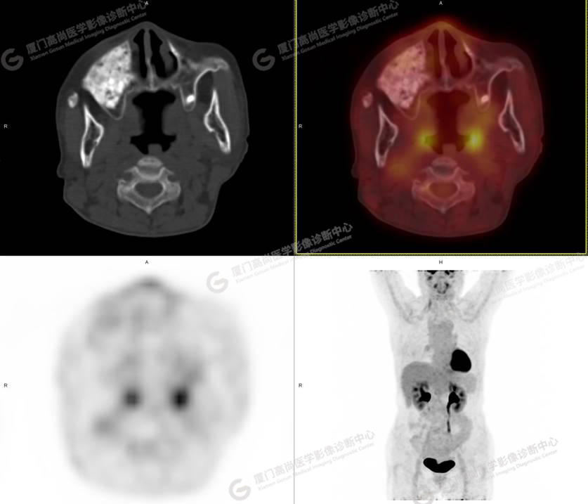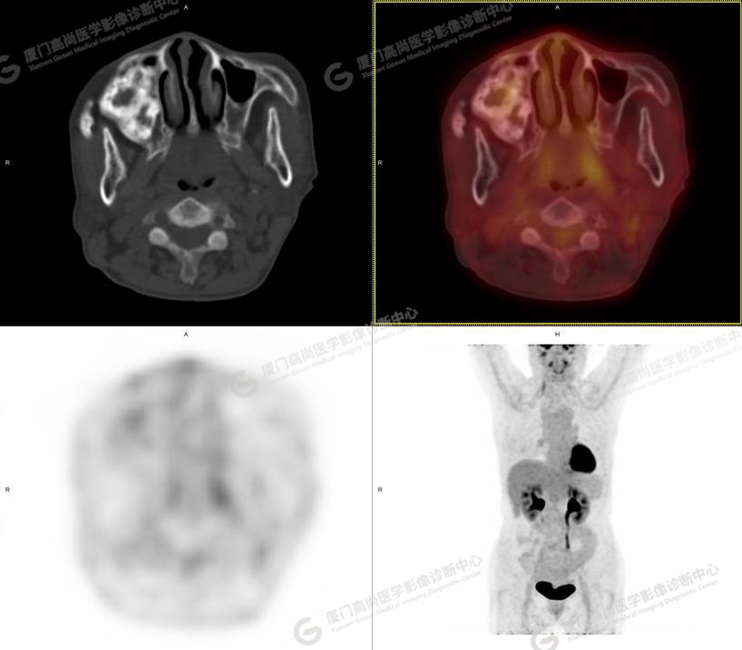 PET/CT所見:右側(cè)上頜骨、右側(cè)顴骨及右側(cè)額骨骨質(zhì)膨脹,其內(nèi)密度不均勻性增高,部分放射性攝取輕微增高,SUVmax 2.27。
