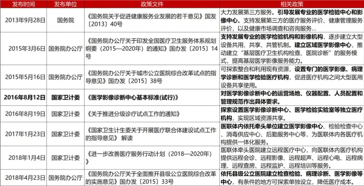 近年來,我國鼓勵第三方醫(yī)學(xué)影像的政策春風(fēng)徐徐吹來。2013年,國務(wù)院發(fā)布《國務(wù)院關(guān)于促進(jìn)健康服務(wù)業(yè)發(fā)展的若干意見》,明確指出“大力發(fā)展第三方服務(wù),引導(dǎo)發(fā)展專業(yè)的醫(yī)學(xué)檢驗(yàn)中心和影像中心”,獨(dú)立影像中心政策的限制得到放開,相關(guān)第三方影像中心在此后發(fā)起成立。2016年8月,國家衛(wèi)計(jì)委出臺《醫(yī)學(xué)影像診斷中心基本標(biāo)準(zhǔn)(試行)》,自此我國醫(yī)學(xué)影像診斷中心行業(yè)發(fā)展得到規(guī)范和指導(dǎo),行業(yè)發(fā)展有章可循。隨后在2016-2018年,后續(xù)政策文件陸續(xù)出臺。