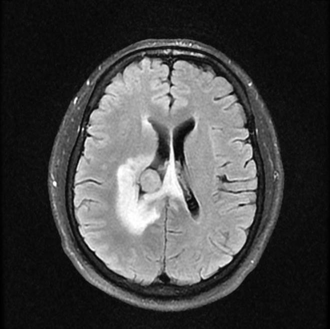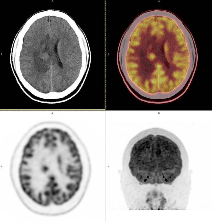 影像診斷: 右側(cè)側(cè)腦室旁腦實質(zhì)內(nèi)結節(jié),代謝異常增高(SUVmax 12.13),伴瘤周水腫。