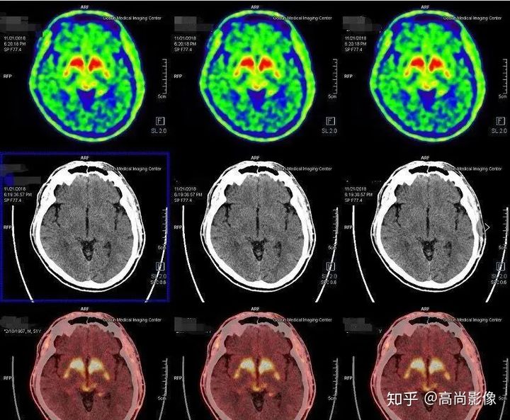 相比之下,童大媽就沒有這么幸運了。除了右邊身子總是抖動,童大媽還有嗅覺障礙、動作緩慢等癥狀。童大媽的PET/CT檢查結(jié)果符合帕金森的表現(xiàn),為臨床診斷提供了重要依據(jù)。