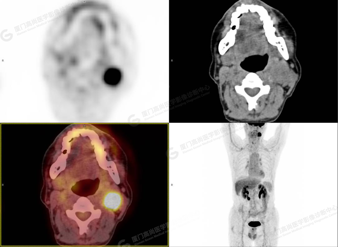 患者男性,60歲,發(fā)現(xiàn)左側頜下淋巴結腫大1月余。自述外院鼻咽鏡陰性,2021/01/28左頜下淋巴結穿刺,結果不確定。2020/12/18外院彩超:甲狀腺結節(jié)(右側葉較大0.7cm×0.6cm,左側葉較大0.6cm×0.5cm),前列腺增生。胸部CT(2020/12/18)慢性支氣管炎。實驗室檢查(2020/12/18)CEA 、AFP、PSA、CA199(-)。