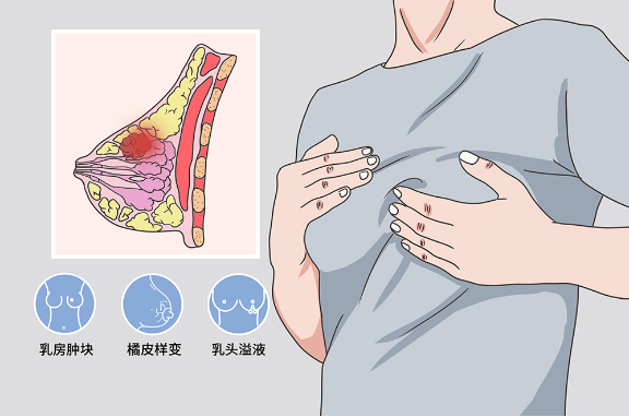 乳腺癌是發(fā)生于乳腺上皮或?qū)Ч苌掀さ膼盒阅[瘤,病因尚不完全清楚,可能與家族史和乳腺癌相關(guān)基因、生殖因素、性激素、營養(yǎng)與飲食、環(huán)境因素等有關(guān)。早期乳腺癌多數(shù)無明顯癥狀,多在健康普查中發(fā)現(xiàn)。大多為乳房無痛性腫塊,晚期出現(xiàn)乳頭回縮、乳腺皮膚“酒窩癥”或橘皮樣變、腋窩淋巴結(jié)腫大等表現(xiàn)。