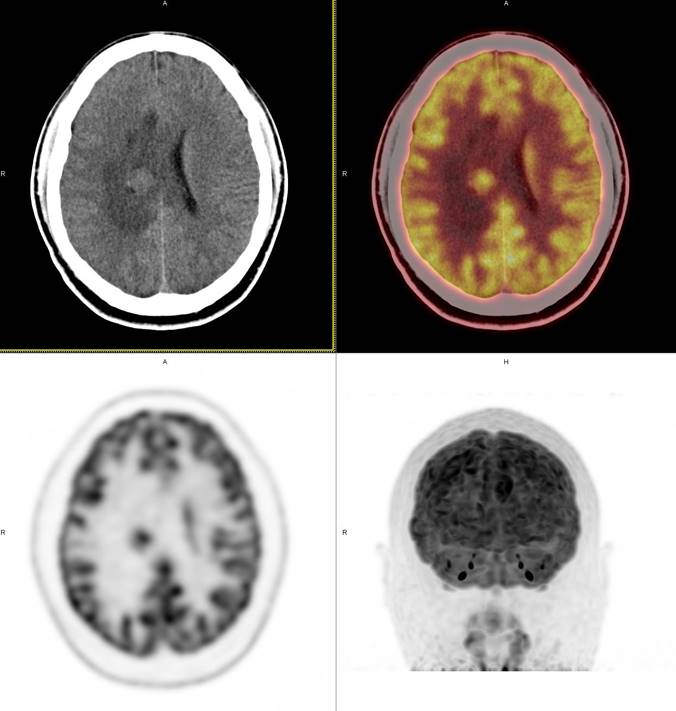 影像診斷: 右側(cè)側(cè)腦室旁腦實質(zhì)內(nèi)結節(jié),代謝異常增高(SUVmax 12.13),伴瘤周水腫。