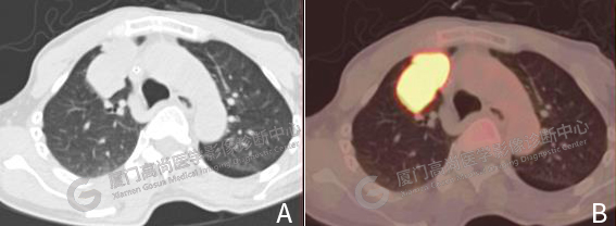 圖1: A 胸部CT圖像,右肺上葉前段軟組織腫塊,邊界清,形態(tài)不規(guī)則,邊緣分葉。B PET/CT胸部融合圖像,F(xiàn)DG代謝明顯增高。