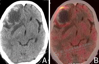 圖2:A CT圖像,右側(cè)額葉見一混雜密度腫塊影,形態(tài)欠規(guī)則,其內(nèi)伴低密度壞死區(qū)。B PET/CT融合圖像,病灶邊緣局限性代謝增高。