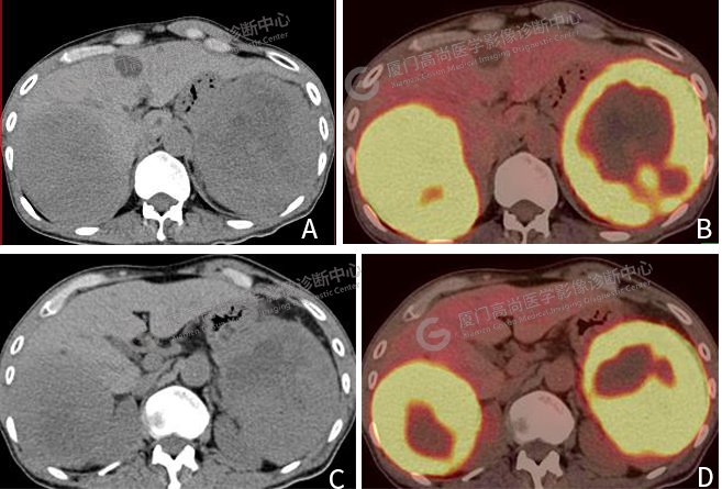圖片圖3:A、 C CT圖像,肝臟右葉巨大腫塊影,脾臟內(nèi)巨大軟組織腫塊,代謝顯著增高。B、 D PET/CT融合圖像,腫塊代謝異常增高。