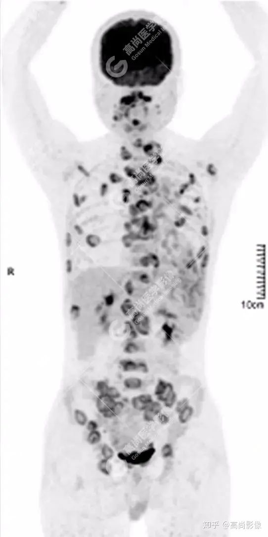 【PET/CT提示】雙肺、左側(cè)胸膜多發(fā)結(jié)節(jié)影,全身多處骨質(zhì)破壞,全身多發(fā)淋巴結(jié)腫大,代謝攝取不均勻性增高。