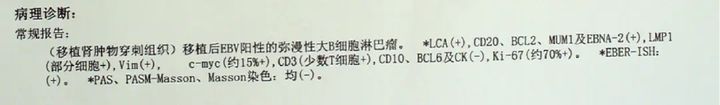 移植腎腫物穿刺活檢病理:移植后EBV陽性的彌漫大B細(xì)胞淋巴瘤。
