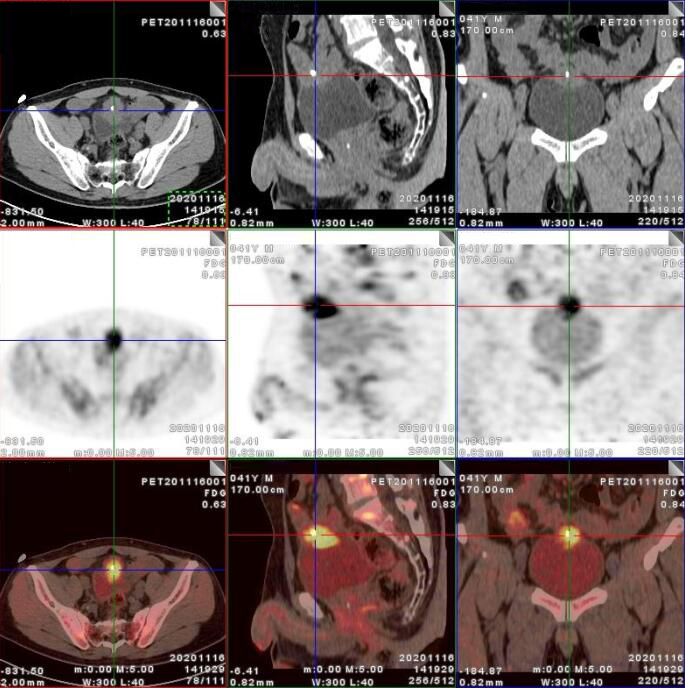 男、41歲血尿查因,外院2020-11-02MRI提示:膀胱前上壁軟組織腫塊,向上生長(zhǎng)至S1椎體水平腹直肌后方,考慮臍尿管來(lái)源惡性腫瘤可能。