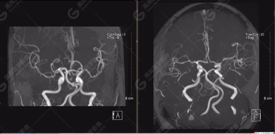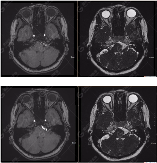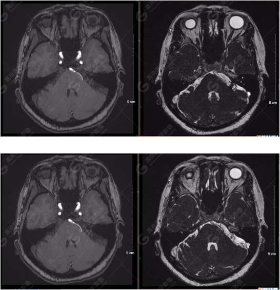 顱腦MRA及ciss序列示腦基底動(dòng)脈環(huán)完整,雙側(cè)頸內(nèi)動(dòng)脈末段、大腦前動(dòng)脈、大腦中動(dòng)脈、大腦后動(dòng)脈及其主要分支顯影良好,管徑及走行正常,無明顯局灶性增粗或變細(xì)。雙側(cè)椎動(dòng)脈末段沿延髓左側(cè)向上走行,左側(cè)面聽神經(jīng)輕度受壓移位,左側(cè)面聽神經(jīng)周圍見細(xì)小血管包繞。右側(cè)面聽神經(jīng)及雙側(cè)三叉神經(jīng)周圍未見異常血管影。