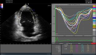 ARIETTA 70-02模式匹配技術(shù)準(zhǔn)確識別并跟蹤感興趣的點(diǎn),智能化分析心肌節(jié)段運(yùn)動(dòng),準(zhǔn)確評估心肌局部運(yùn)動(dòng)功能及各節(jié)段運(yùn)動(dòng)的協(xié)調(diào)性,構(gòu)建左室“牛眼圖”,直觀顯示心室各段功能狀態(tài)。