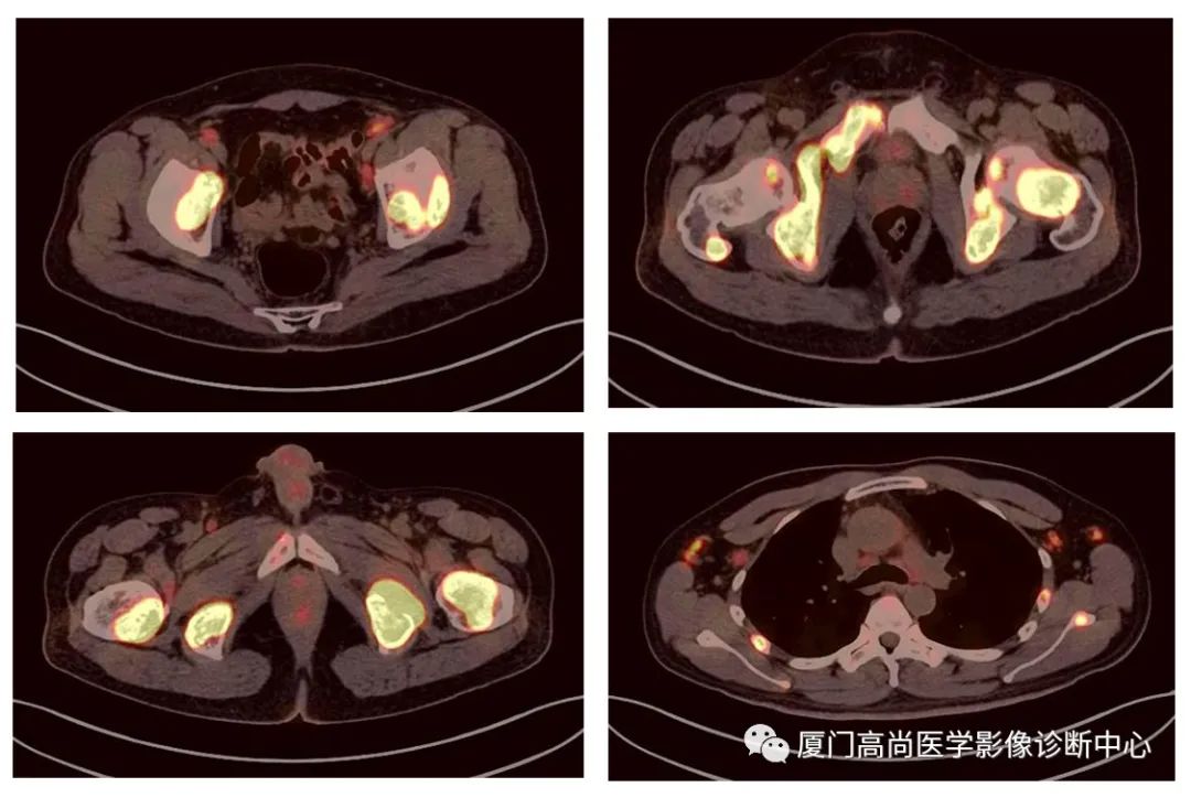 病例1:某男士,36歲,半年前摔傷,當(dāng)時無大礙,近幾個月來腰腿痛,并逐漸加重,消瘦10多斤。MRI檢查發(fā)現(xiàn)腰椎、骨盆 骨質(zhì)異常信號,查血各項腫瘤標(biāo)記物正常,因診斷不清而來做PET/CT檢查
