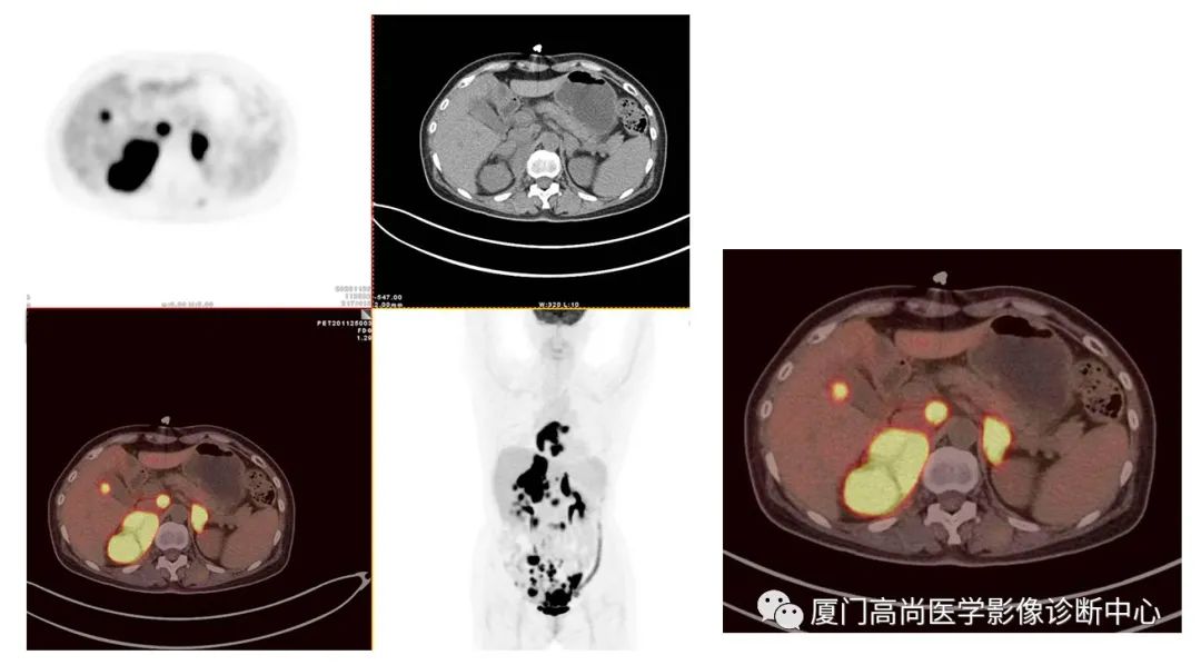 病例2、某女士,62歲,近3個月來自覺消瘦,無其他自覺癥狀,CT發(fā)現(xiàn)雙側(cè)腎上腺增大,性質(zhì)待定,查血各項腫瘤標(biāo)記物均正常,臨床診斷不清,申請做PET/CT檢查