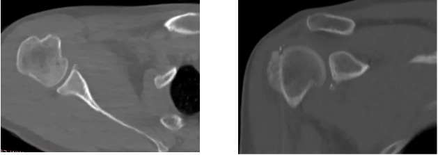 CT圖示:右側(cè)肱骨后外上方局部骨皮質(zhì)塌陷,連續(xù)性中斷(箭頭);肩胛盂前下份邊緣變鈍,見高密度分離小骨片影(三角形)。