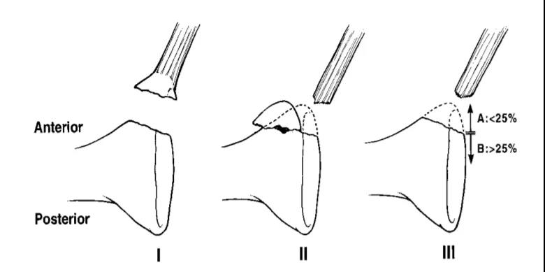 Bankart損傷是肩關(guān)節(jié)盂唇前下方在前下盂肱韌帶復(fù)合體附著處的撕脫性損傷。因肩關(guān)節(jié)前脫位引起,是造成習(xí)慣性前方不穩(wěn)定和脫臼的常見損傷原因。纖維性Bankart損傷:關(guān)節(jié)囊破裂,盂肱韌帶連同附著的關(guān)節(jié)盂唇從關(guān)節(jié)盂上撕脫。骨性Bankart損傷:肩關(guān)節(jié)孟前方的骨折或伴有肩關(guān)節(jié)前脫位的孟唇缺損??煞譃槿?,Ⅰ型:骨折塊與關(guān)節(jié)盂分離,沒有接連;Ⅱ型:骨折塊與關(guān)節(jié)盂非解剖位接連;Ⅲ型:分二個(gè)亞型,即ⅢA型前方盂唇磨損<25%,ⅢB 型前方盂唇磨損 >25%。(如下圖)影像學(xué)方法
