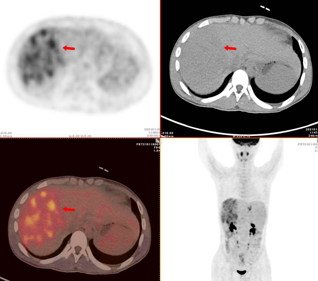 13歲男孩小新,因腹瀉就診,外院CT發(fā)現(xiàn)肝臟多發(fā)占位,考慮肝癌并肝內(nèi)轉(zhuǎn)移,肝硬化、門靜脈癌栓形成。為了查找病因及進行更深入的檢查,小新一家選擇進行全身的PET/CT檢查。據(jù)悉小新有乙肝病史10年。