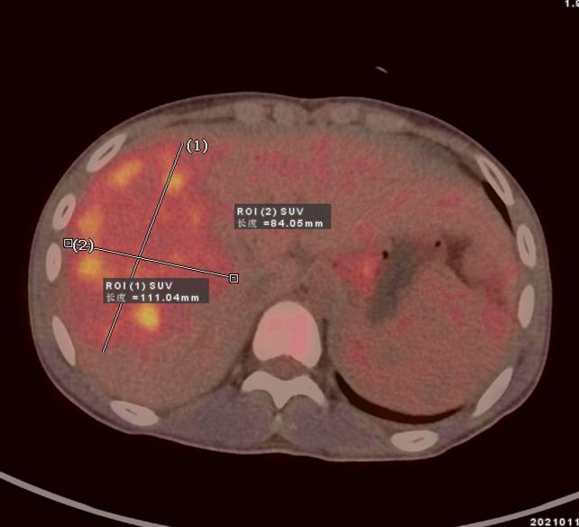 PET/CT診斷:原發(fā)性肝細胞肝癌 (多發(fā)結(jié)節(jié)型)并壞死、出血、門靜脈右支癌栓形成;肝硬化