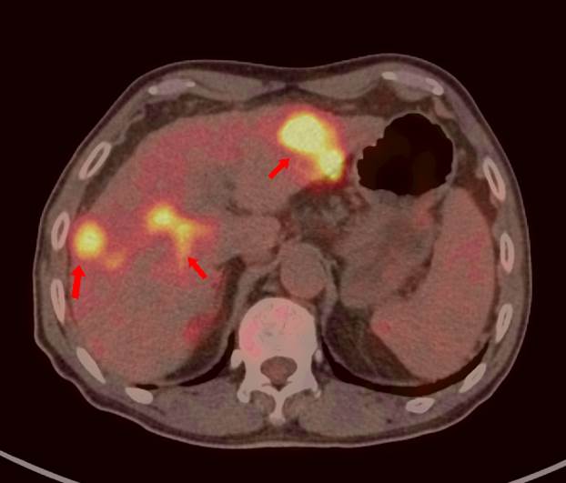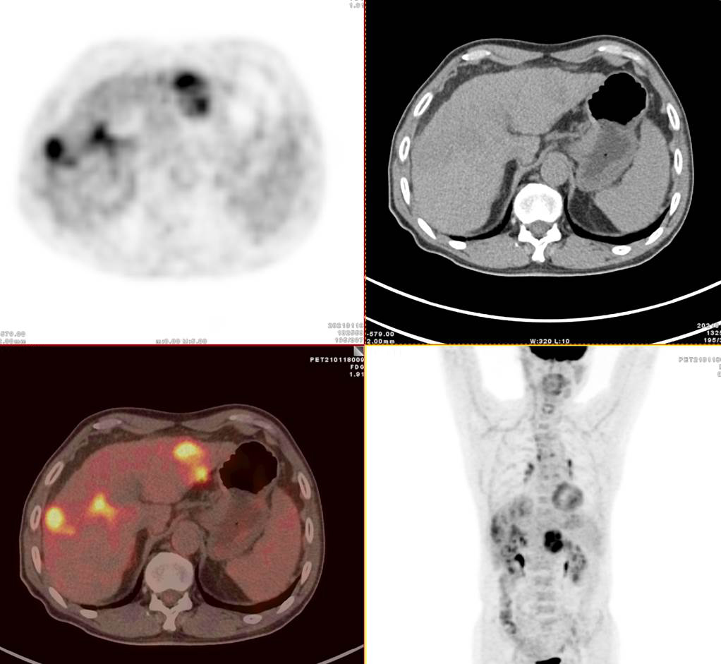 PET/CT顯示肝臟左右葉內(nèi)多發(fā)大小不等稍低密度結(jié)節(jié),最大病灶5.8x5.5cm,密度不均,F(xiàn)DG攝取不同程度最高,SUVmax3.9-9.6,門靜脈右支增寬,F(xiàn)DG攝取最高,SUVma 4.9。