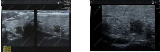 二維超聲:右側(cè)葉探及低回聲結(jié)節(jié),邊界欠清,形態(tài)欠規(guī)則,縱橫比>1,內(nèi)可少許細(xì)點(diǎn)狀強(qiáng)回聲,后方回聲無(wú)明顯變化。