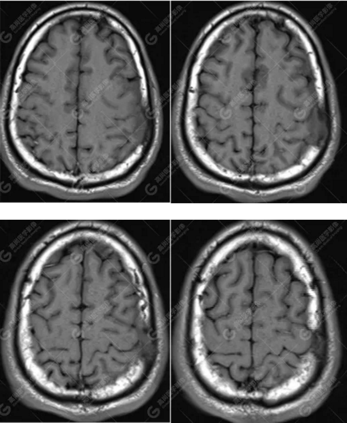 腦膜瘤起源于蛛網(wǎng)膜細(xì)胞或蛛網(wǎng)膜帽狀細(xì)胞, 常發(fā)于中老年,女性好發(fā),形態(tài)上多呈半圓或橢圓型隆起的顱內(nèi)腦外病變,典型MRI影像表現(xiàn)為在 T1WI及T2WI等信號(hào),但腦膜瘤病理亞型較多,依據(jù)其組織成分不同 T2WI 信號(hào)可有改變;