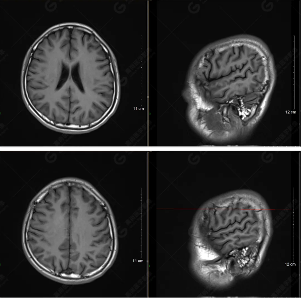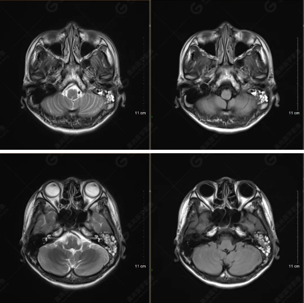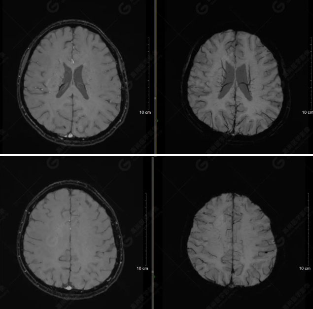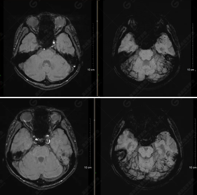 顱腦MRI平掃未見明顯異常,左側(cè)乳突內(nèi)積血,建議補(bǔ)充SWI檢查。(左側(cè)為薄層原始圖像,右側(cè)為后處理5mm圖像)