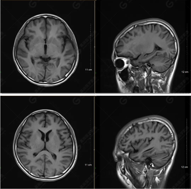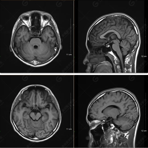 雙側(cè)大腦半球?qū)ΨQ,灰白質(zhì)對比正常,顱內(nèi)未見異常信號影。腦室系統(tǒng)未見擴(kuò)大,中線結(jié)構(gòu)居中。腦溝、裂未見增寬。幕下小腦、腦干未見異常。矢狀位示垂體形態(tài)、大小級信號未見異常。所示左側(cè)乳突內(nèi)見多發(fā)短T1長T2信號影。