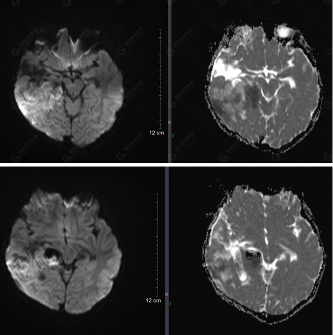 右側(cè)顳葉腫瘤切除術(shù)后(具體不詳):右側(cè)顳部骨質(zhì)不連續(xù)呈術(shù)后改變,右側(cè)顳葉術(shù)區(qū)見(jiàn)片狀長(zhǎng)T1長(zhǎng)T2信號(hào)影,F(xiàn)LAIR呈低信號(hào);術(shù)區(qū)后方右側(cè)顳枕葉見(jiàn)一巨大占位性病變影,邊界欠清,大小約6.2×5.8×4.3cm(前后×左右×上下),信號(hào)不均勻,T1WI呈等稍低信號(hào)間雜少許高信號(hào),T2WI呈高稍低混雜信號(hào),DWI示部分病灶彌散受限,相應(yīng)ADC圖減低,磁敏感序列見(jiàn)部分呈極低信號(hào),增強(qiáng)掃描可見(jiàn)明顯不均勻強(qiáng)化,鄰近硬腦膜及小腦幕增厚并明顯強(qiáng)化;另延髓右前方及右側(cè)橋小腦角區(qū)見(jiàn)一不規(guī)則形異常信號(hào)影,大小約3.2×1.3×3.7cm(左右×前后×上下),呈長(zhǎng)T1稍長(zhǎng)T2信號(hào),F(xiàn)LAIR呈等信號(hào),DWI未見(jiàn)受限,增強(qiáng)后明顯均勻強(qiáng)化,鄰近腦膜明顯強(qiáng)化。鄰近腦實(shí)質(zhì)及右側(cè)顳角明顯受壓;左側(cè)大腦半球未見(jiàn)局灶性信號(hào)異常,中線結(jié)構(gòu)稍左移。