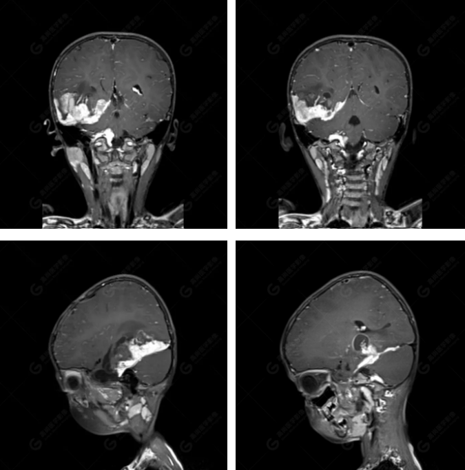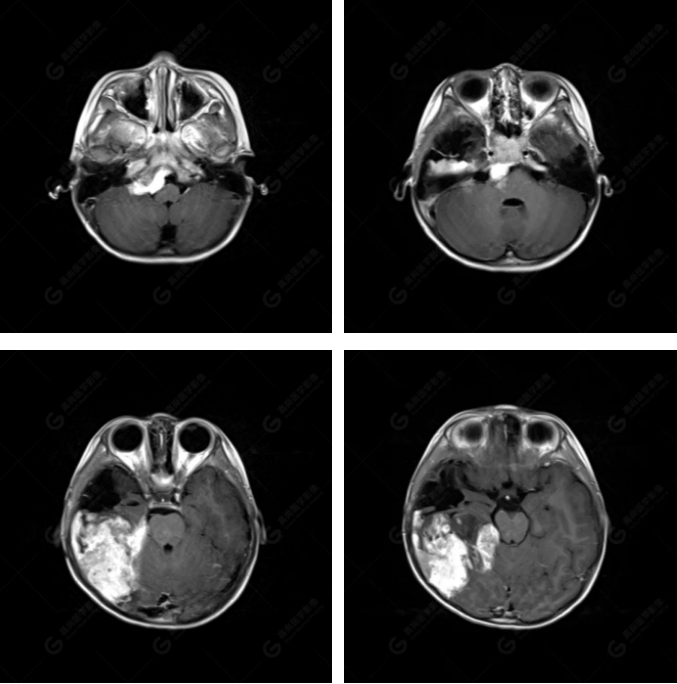 右側(cè)顳葉腫瘤切除術(shù)后:現(xiàn)術(shù)區(qū)后方右側(cè)顳枕葉及延髓右前方占位,右側(cè)顳枕部硬腦膜及小腦幕明顯強(qiáng)化,結(jié)合既往影像資料,考慮為胚胎源性惡性腫瘤,如非典型畸胎樣/橫紋肌樣瘤(AT/RT)或原始神經(jīng)外胚層腫瘤(PNET)。