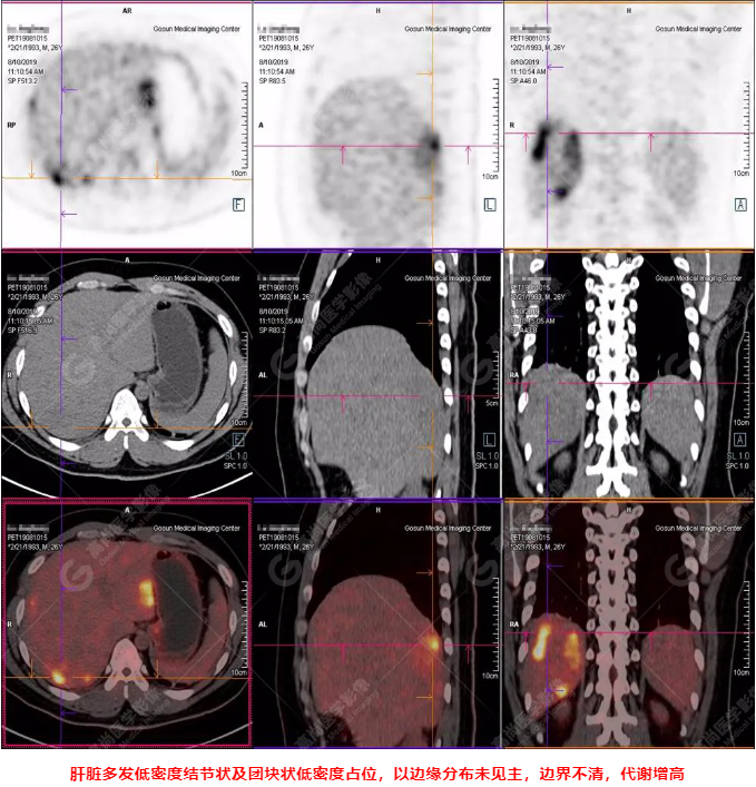B超及CT檢查發(fā)現(xiàn):肝臟多發(fā)低密度占位。