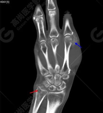 藍(lán)色箭頭提示踝關(guān)節(jié)滑囊內(nèi)、肌腱內(nèi)多發(fā)稍高密度結(jié)節(jié)影。