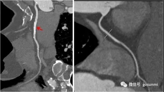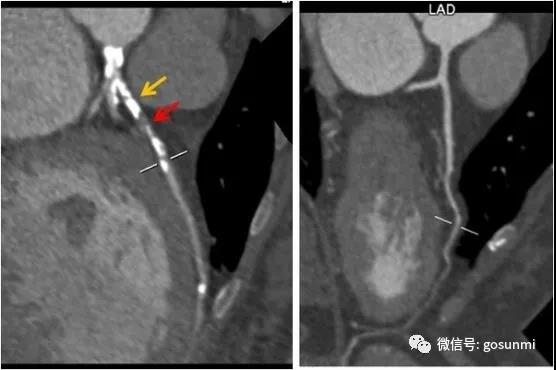 通過(guò)冠脈CTA三維重建,可以再現(xiàn)冠狀動(dòng)脈的形態(tài)、走行,從中了解冠脈的通暢情況。當(dāng)出現(xiàn)冠狀動(dòng)脈粥樣硬化時(shí)(如下圖所示),我們可以看到冠脈的管壁變厚了,并且出現(xiàn)了鈣化斑塊及部分軟斑塊、管腔不均勻的變窄現(xiàn)象。一般當(dāng)出現(xiàn)重度狹窄(狹窄程度>75%)時(shí)便需要進(jìn)行積極的臨床干預(yù)。(左圖為重度狹窄的前降支,黃箭為鈣化,紅箭為軟斑塊、重度狹窄部位,而右圖為正常的左冠前降支)。