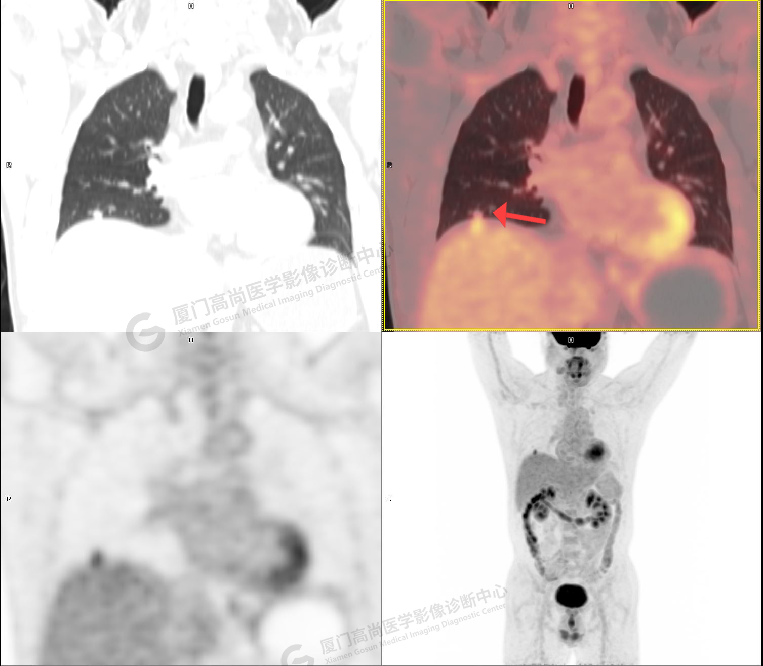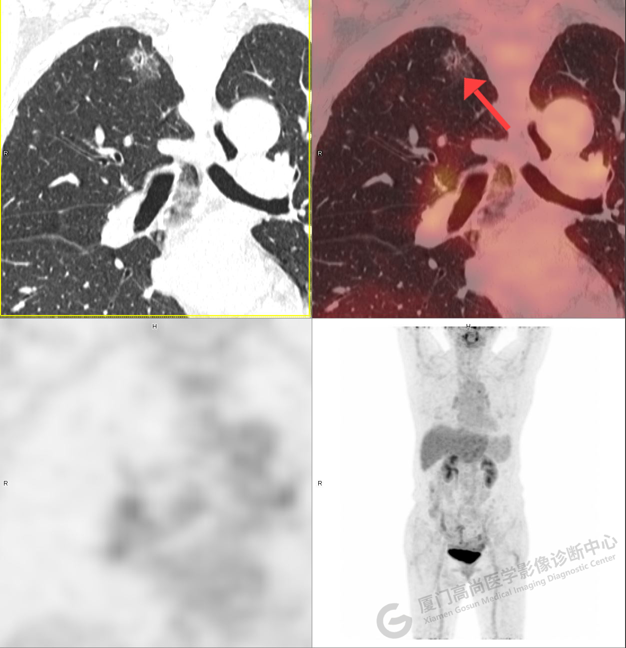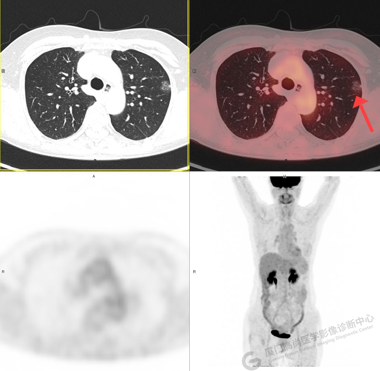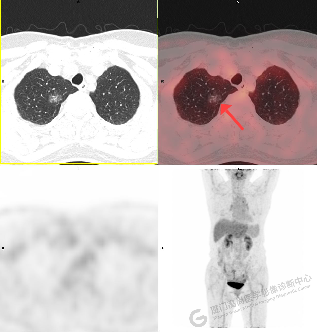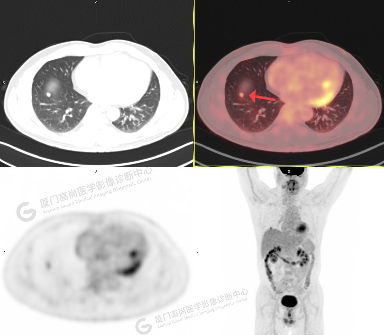 PET/CT示:右肺上葉尖段混雜密度結(jié)節(jié),代謝不高,考慮為早期肺癌(微浸潤腺癌),建議病理學(xué)檢查。