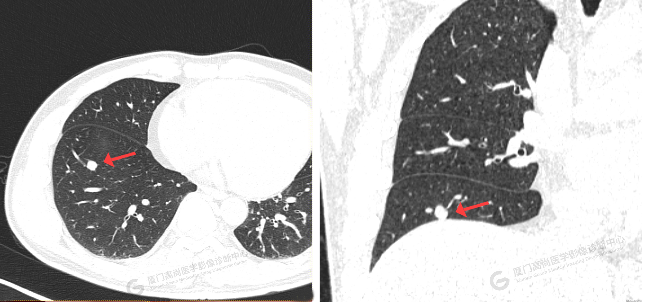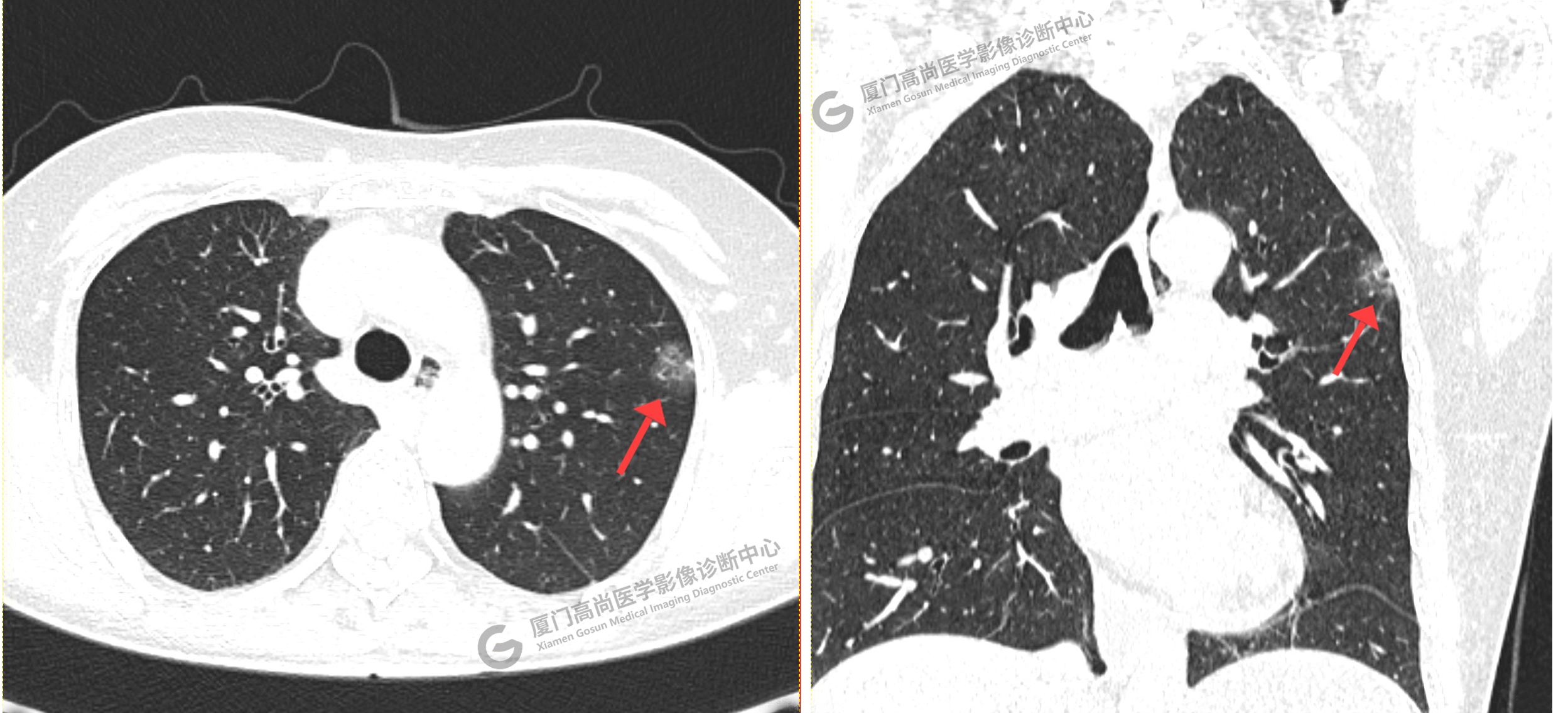 田女士公司安排健康體檢,在我中心進(jìn)行了胸部CT檢查。