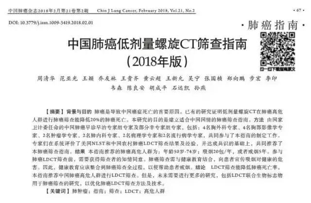 《中國肺癌雜志》2018年2月刊刊登了一篇名為《中國肺癌低劑量螺旋CT篩查指南(2018年版)》,文中分析了CT對于肺癌早期篩查的意義,并推薦吸煙或者有肺癌家族史等高危人群進(jìn)行CT篩查肺癌。