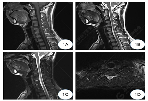 1A-1C圖、常規(guī)仰臥位T1WI及T2WI矢狀位圖示頸椎生理曲度變直,椎體形態(tài)及信號(hào)均正常,椎間隙正常,椎管未見狹窄;1D圖、常規(guī)仰臥位T2WI橫軸位示C5-6水平硬膜外間隙未見增寬,相應(yīng)水平頸髓未見受壓。